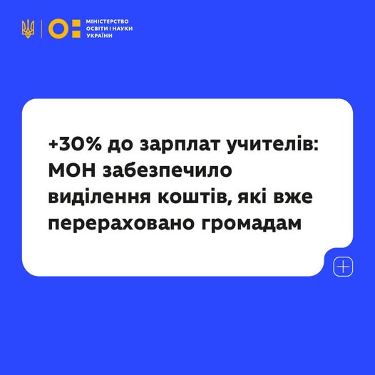 Нагадаю: уряд ухвалив політичне рішення — з 1 січня 2026 року заробітна плата вчителів має зрости на 30%. Для цього в державному бюджеті на 2026 рік передбачено додатковий фінансовий ресурс, а на початку січня ці кошти вже доведені до громад у складі освітньої субвенції — з урахуванням цього підвищення.
