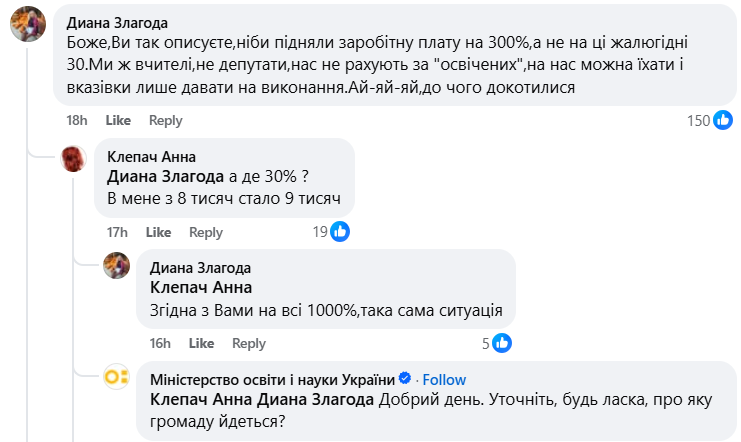 Якщо під час порівняння розрахункових листів освітяни не знаходять 30% підвищення — необхідно йти за роз’ясненням до керівника закладу. Закликаю вчителів звертати увагу не лише на обіцяне підвищення заробітної плати — з 1 січня на 30%, а й на розмір усіх нарахованих вчителям надбавок. Вони не повинні бути зменшеними. Якщо ж і після розмови з адміністрацією школи ви не отримали відповідей на свої фінансові питання, можна звертатися в Міністерство освіти і науки України (відкрита гаряча лінія) або до освітнього омбудсмена.
