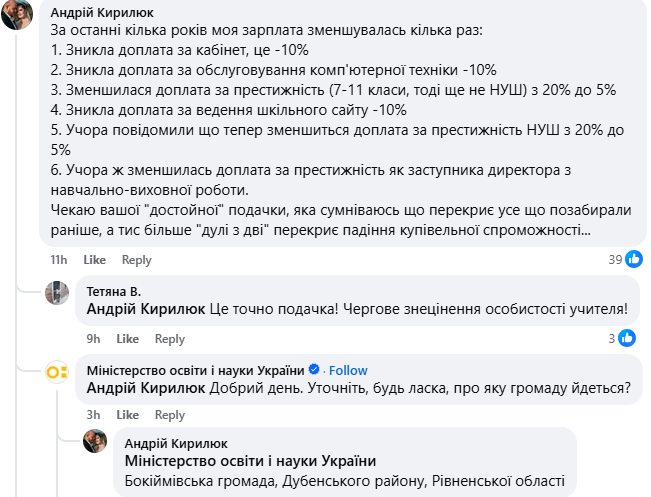 Надія Лещик: — Перш за все, хочу сказати, що подібні скарги ми отримуємо вже кілька років. Так у 2024 році було 100 звернень на цю тему, у 2025 — 111. Йдеться про зменшення або скасування доплат та надбавок, зокрема — за престижність професії, за завідування кабінетоми, за роботу з дітьми з особливими освітніми потребами тощо. Щодо очікування виплати зарплати за січень цього року, зараз немає масовості у зверненнях, але все ж вони є. Втім збільшення ми очікуємо на початок лютого, на момент завершення фінансового місяця.